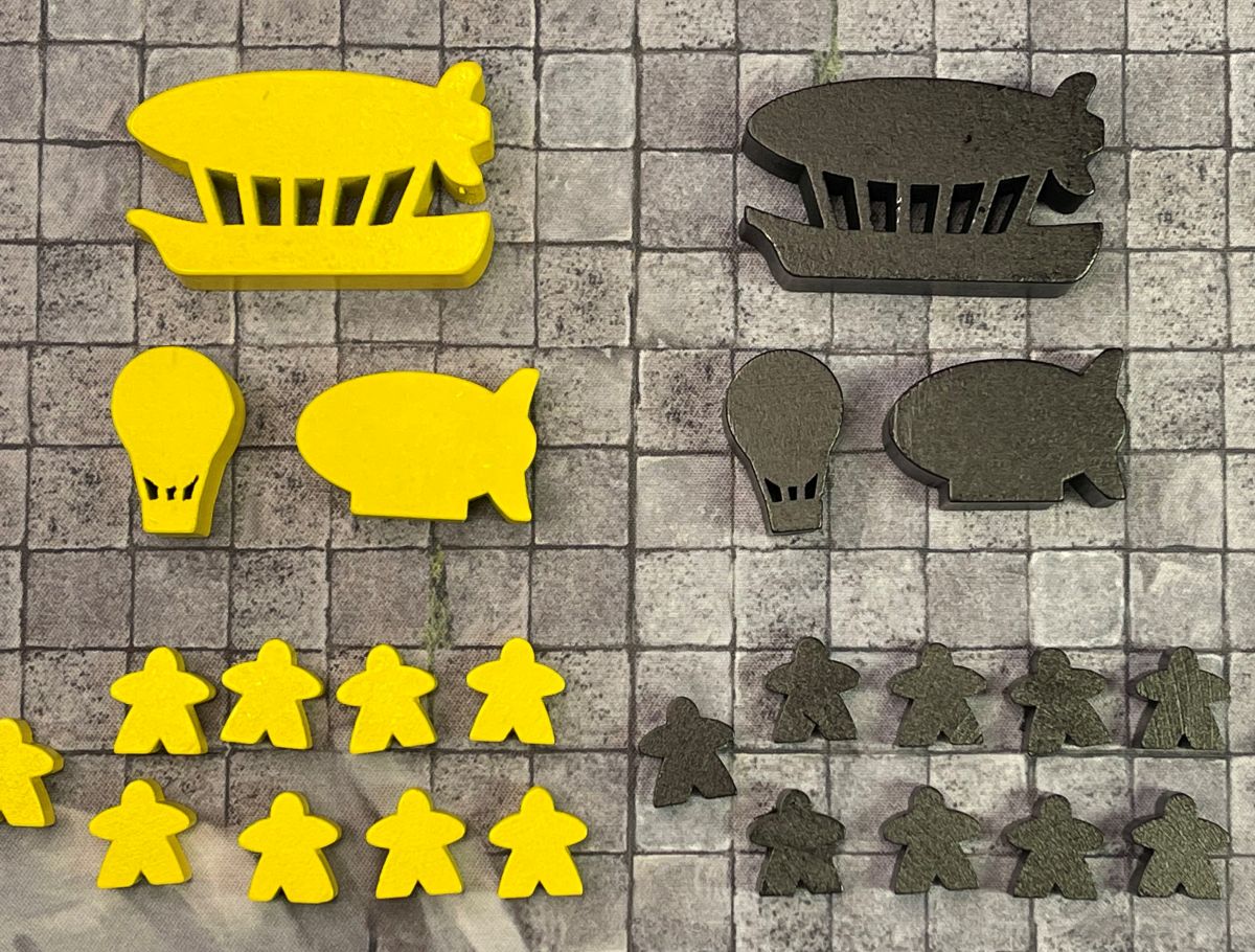 If you’ve read any of my previous reviews, you know what a big fan I am of fun meeples. Well, Whistle Mountain has them in spades. Each player will get three different wooden airships and a number of wooden meeples in their chosen player color.