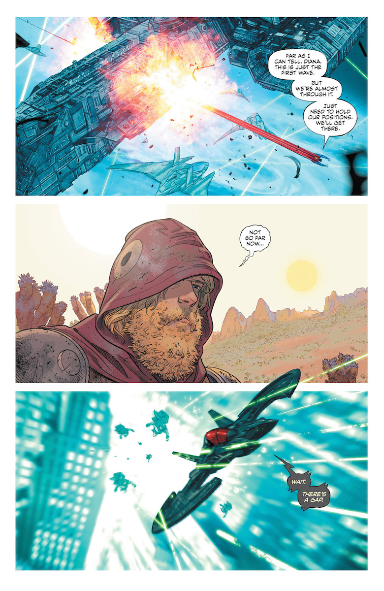 And the setup of the Shaner-drawn Rann segments is equally strong. This issue shows us the aftermath of Adam’s brutal capture and psychological torture, as he returns to a war that’s already been partially lost in his absence. He starts distancing himself from his wife and daughter, culminating in an explosion that’s as tense as most of the action scenes. When he’s brought in for interrogation by Sardath, the story takes a shockingly violent turn as we start to see Adam Strange slip away from sanity and towards depravity. As the issue closes, we head towards what might be the defining story. Unfortunately, we’re going to have to wait a little longer to get to that moment, as the series is going bimonthly for the last act. It’s a disappointment given how addictive this series is, but given the spectacular art each month, it’s more than worth the wait.