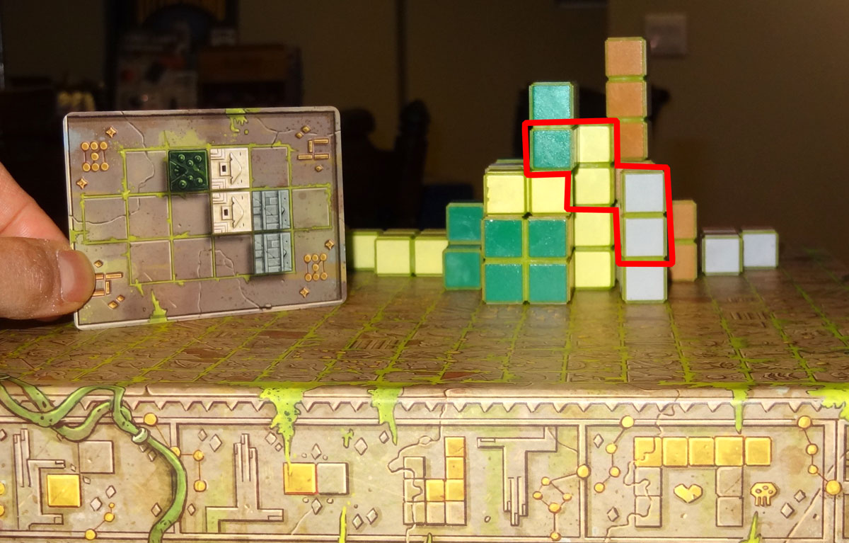 As you place blocks, your goal is to complete your key cards by creating the depicted pattern, as seen from your perspective. Empty spaces on your key card may be empty or occupied by any color blocks, and you can rotate the card in any orientation (but you can’t mirror the pattern). You may complete multiple key cards in one turn, but each card completed must use at least one face from the block you placed this turn. Other players can come look at the board from your point of view to confirm that you’ve matched the pattern, but otherwise players should only be looking at the ruins from their own side.