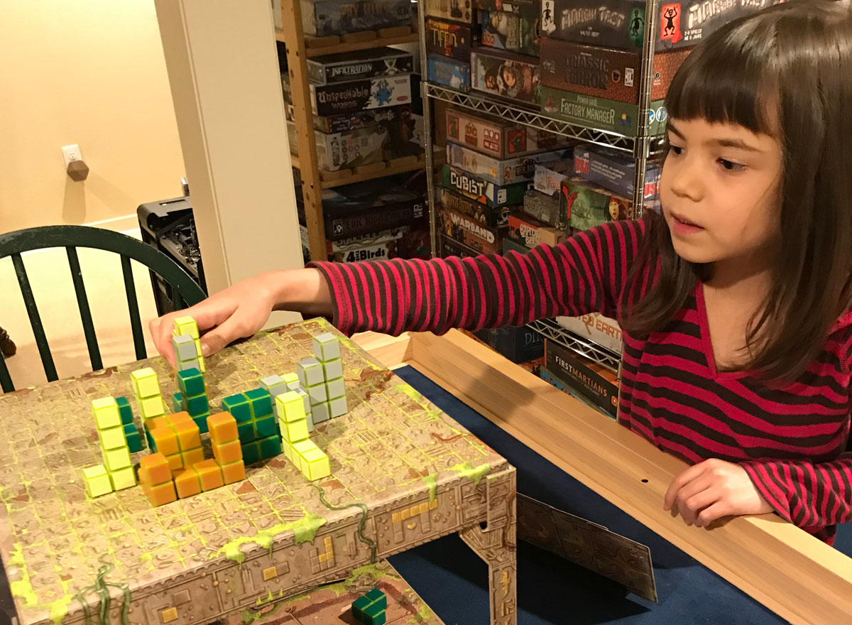 My kids and I enjoyed Block and Key, and it’s one I would recommend for puzzle-lovers and fans of building stuff. The clay blocks provide a nice tactile play, with a weight that wooden or plastic pieces can’t match. The two-tiered board is a nice touch that elevates (ahem) this game to new heights—important for a game where your perspective matters.