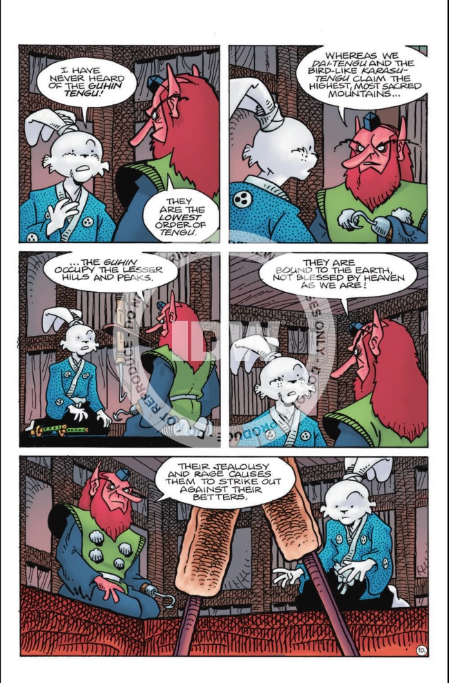 Usagi Yojimbo #16 continues where we left off, when Usagi found his former teacher, a Tengu by the name of Sojobo, laying on his home severely injured.