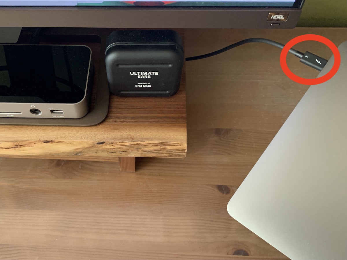 When I first set this system up, the USB-C power cable that came with the MBP was the first one I grabbed. So I used it to connect the laptop to the dock. In terms of data and power to the laptop, all was good, but the laptop could not connect to the monitor via the dock’s Mini DisplayPort. I already had a USB-C cable hanging off the monitor for connecting to other laptops, so I just shrugged and connected the monitor to the laptop directly, using the dock for data and power only.