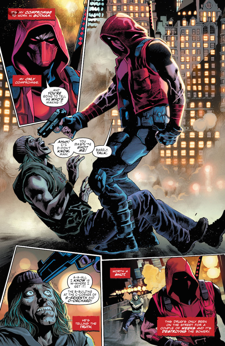 That would be Chip Zdarsky, who teams with regular Bat-artist Eddy Barrows on a Red Hood/Batman story. Red Hood’s gotten quite the spotlight lately with a-list talents taking on the Batfam’s bad boy. From the start, there’s a clever twist to explain Red Hood’s closer work with his family—he uses rubber bullets now. This oversized story—about thirty pages—pits both Red Hood and his former mentor against a new street drug that’s destroying Gotham. Called Cheerdrops, it seems to work like a drug version of the Black Mercy—making people see their fondest desires, even as it puts them in a coma or makes them take extremely risky moves like walking into traffic. While Batman and Red Hood chase different leads, Red Hood encounters a kid whose mother has fallen victim to the drug. Flashbacks shed some new light on the complex relationship between Bruce and Jason, and the story builds to a brutal and emotional climax that will likely put new stress on that father-son bond. It’s more proof that Zdarsky, while often known for his comedy, is one of the best dramatic writers in comics.