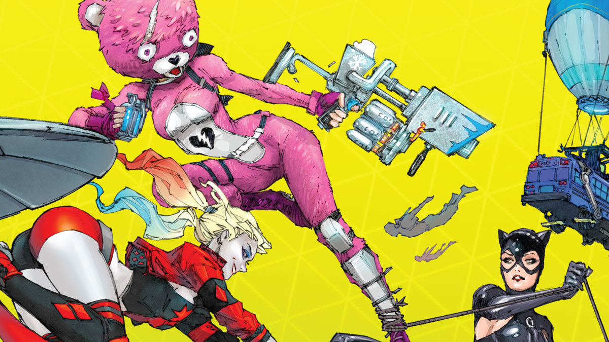 Ray: DC has put out a lot of odd books over the years, and they’ve put out a lot of unique crossovers over the years. But they may have topped themselves with this one, a crossover between the relatively down-to-earth vigilante Batman, one of the least cosmic heroes in the DCU, and the gleefully surreal and wildly popular multiplayer game Fortnite. They’re oddly not the first comic company to cross over—the competition briefly had Thor in the world of Fortnite as well—but this six-issue miniseries scripted by veteran DC writer Christos Gage is the most in-depth crossover yet. It starts in a relatively routine way for the DCU, with Batman investigating a massive disturbance in the form of a glowing purple portal in the middle of Gotham. He tries to keep Harley Quinn from jumping in (because why wouldn’t she? Fun is fun), only to then be ambushed himself and fall in. And that’s when things get surreal.