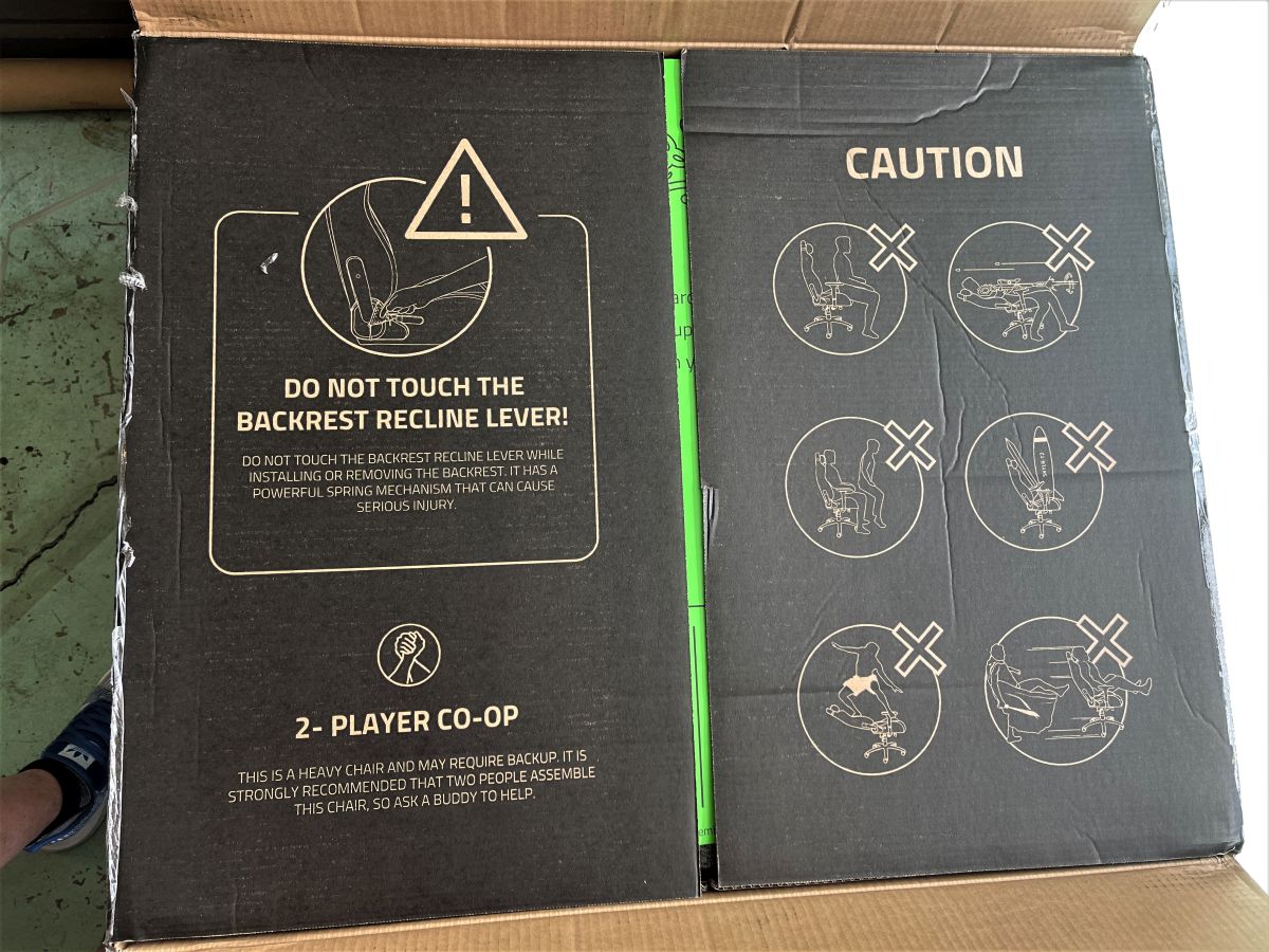 Opening the box, you’re immediately greeted by some cautionary messages on the box flaps. I’m somewhat curious as to how many people with Iskurs also own six-foot rockets, but nevertheless, Razer makes it very clear you should neither leave your rocket on the seat of your gaming chair, nor launch it from that spot.