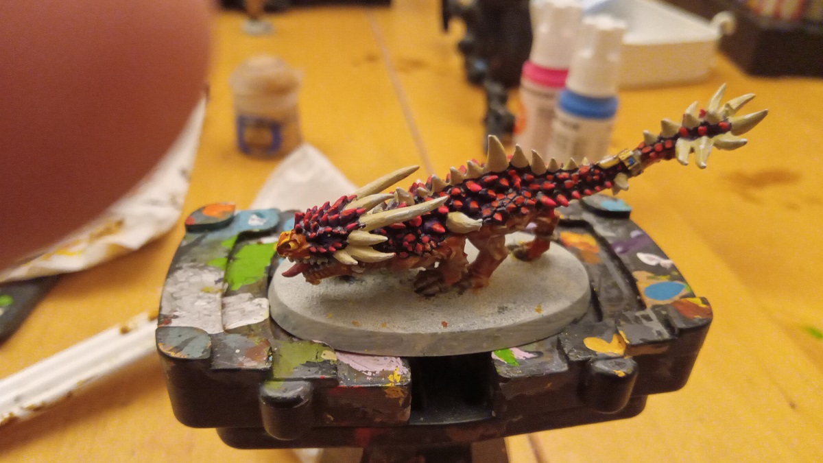 I highlighted the scales with AK Fluorescent Magenta, used White Scar for the tips of the horns and Flash Gitz Yellow for the highlights on the underbellies and face.