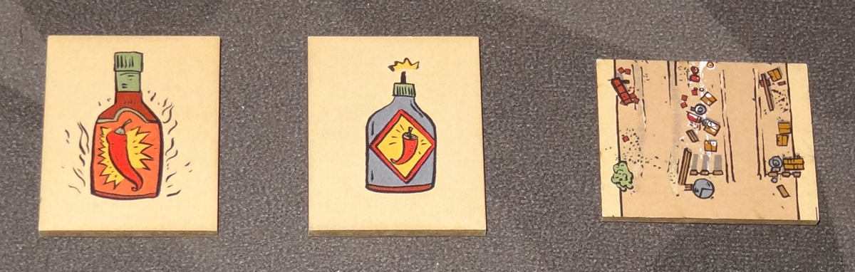 Don Falconi has two chili-bomb tokens, which may be used in two different ways: place it behind him (bomb side up) to block a road, or place it (road side up) to break through a roadblock or barrier to create a new path. Either way, the changes made by the bomb affect all players.