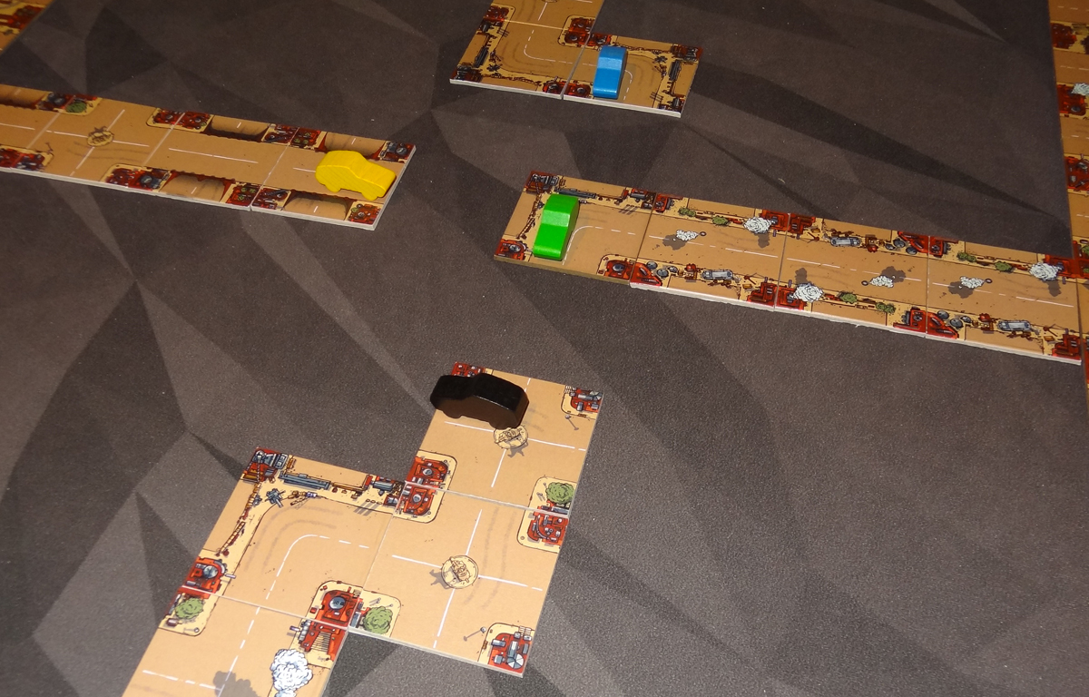 The advanced mode gives players a little more choice (and also prevents you from getting totally stuck because you can use your whole turn to change direction if needed). You can choose to spend your actions laying tiles, drawing tiles, or driving. However, because you can only place tiles orthogonally adjacent to you, what it means is that, for the first portion of the game, it still feels a lot like the basic game with a hand of 2 tiles: on average, you’ll use your three actions to draw, place, and drive once each.