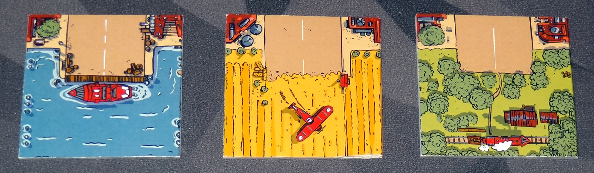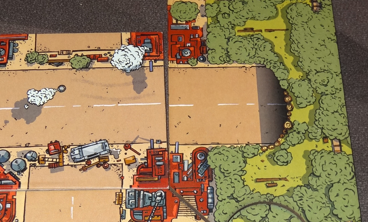 There are 6 types of road pieces with different configurations, including a dead-end that serves as a U-turn, and an overpass/underpass. There are some fun details on the road tiles and particularly on the four borders: the prison is mostly red and matches a lot of the rest of the city, and the three others are yellow farmlands, green forests, and a blue waterfront. In the prototype, these 6 types are just repeated, but the campaign has stretch goals to add some different artwork—for instance, some tiles representing Little Italy or Chinatown, for a bit more variety. The entire board (at least in the prototype) was about 2 feet square, which is a nice, large size that lets you appreciate the details on the tiles.