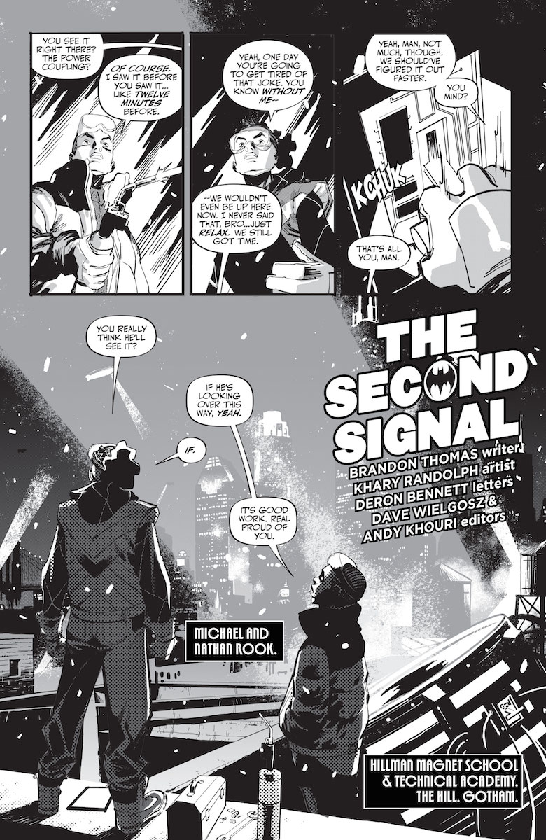 First up, it’s Brandon Thomas and Khary Randolph on a tale that introduces a pair of promising new characters to Gotham—Nathan and Michael Rook. Two young African-American brothers from the Hill area of Gotham, they build a second Bat-signal to alert Batman to a crisis of kidnappings in their neighborhood—an area where Batman rarely patrols. It’s a strong Mad Hatter tale, but it’s also a good look at the blind spots of Batman’s mission and a nice follow-up to the classic Priest tale set in this neighborhood.