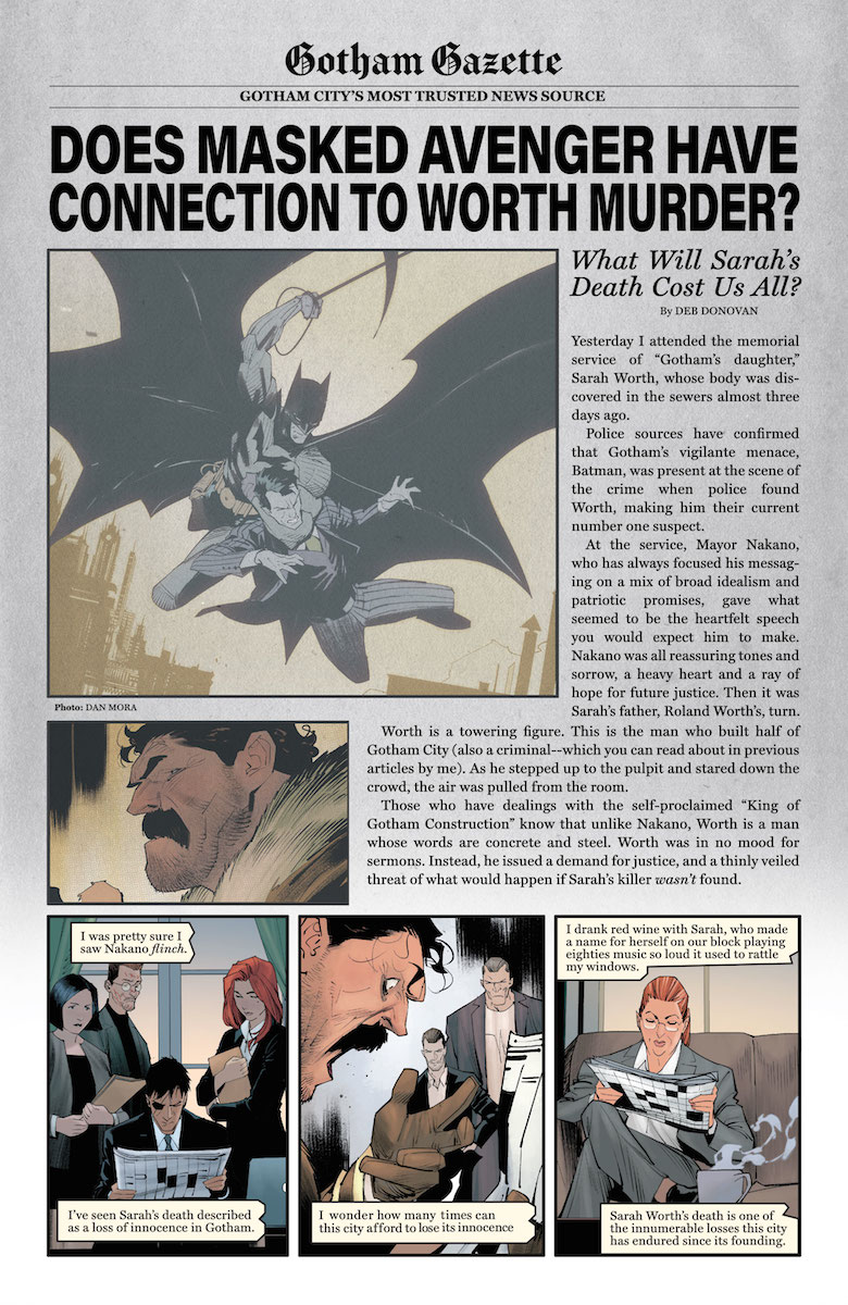 Ray: Mariko Tamaki seems interested in answering one of the great unanswered questions of Gotham—how many people die there without anyone noticing? The murder of Sarah Worth has gripped the city, due to a combination of media attention and the demands of her father. Mr. Worth, the hulking criminal businessman, has no problem bursting into the Mayor’s office and openly threatening him, which means all police focus is on this case. But at the same time, her killer is out there hunting random women to virtually no attention. And then there’s the question of why exactly Sarah Worth—or someone who looks like her—just showed up on Bruce Wayne’s street begging for his help.