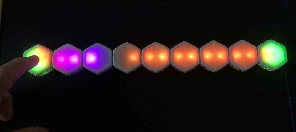 Other games involve different mechanics and skills. Astro has the blinks spread out around the table and not touching. Players then select one of the “asteroids” and long-press it for 1.5 seconds to make it their ship. It flashes a color of what type of color it needs to mine from asteroids. Players then connect their ships to one asteroid at a time that has their color. Once their ship is full of that color, the color will change. The player who completes 6 missions first is the winner.