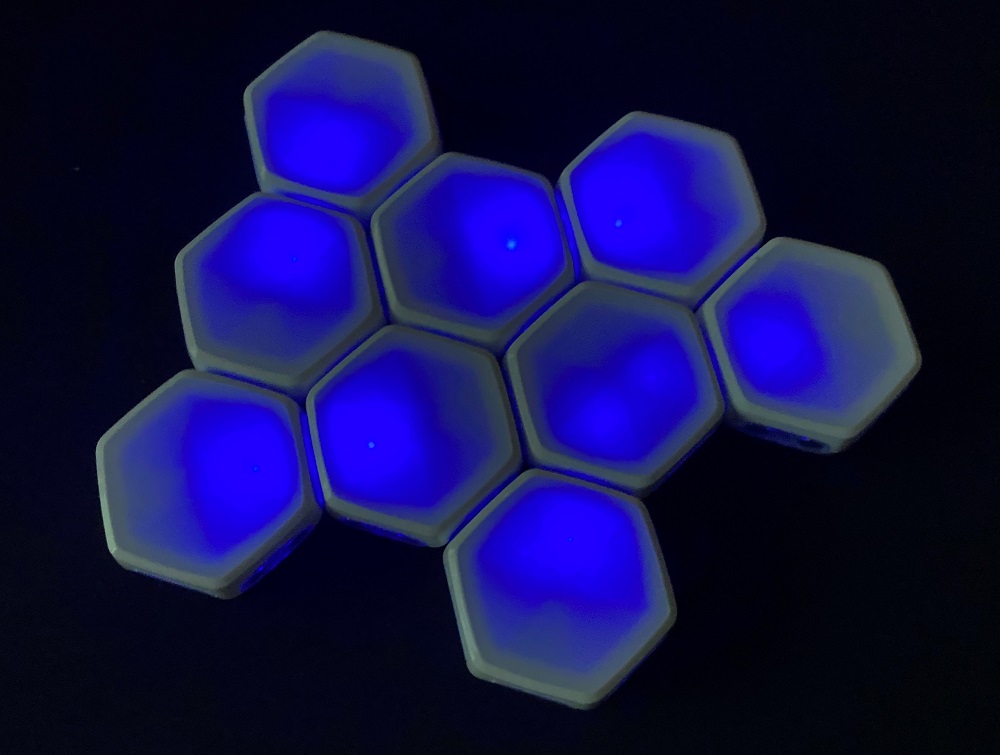 Darkball is a game requiring timing and can be played solo or with other players. The blinks are connected in any arrangement with an endpoint for each player, which is a blink only connected to one other blink. A “ball” moves along the path of blinks. When it gets to an endpoint, the player there must press the blink to bounce the ball back. If you click too early, the endpoint goes dark and you can’t bounce for a short amount of time. If you click too late, then your blink takes damage and one of the LEDs turns red. When a player takes 6 damage, then they are out and the last player remaining is the winner. There are also puzzle-like games where you have to connect blinks so matching colors are connected. You can even use blinks for other games. The Widgets game lets you set up your blinks to act like a six-sided die, a spinner, a coin toss, and even a timer which can be set from 1-5 minutes.