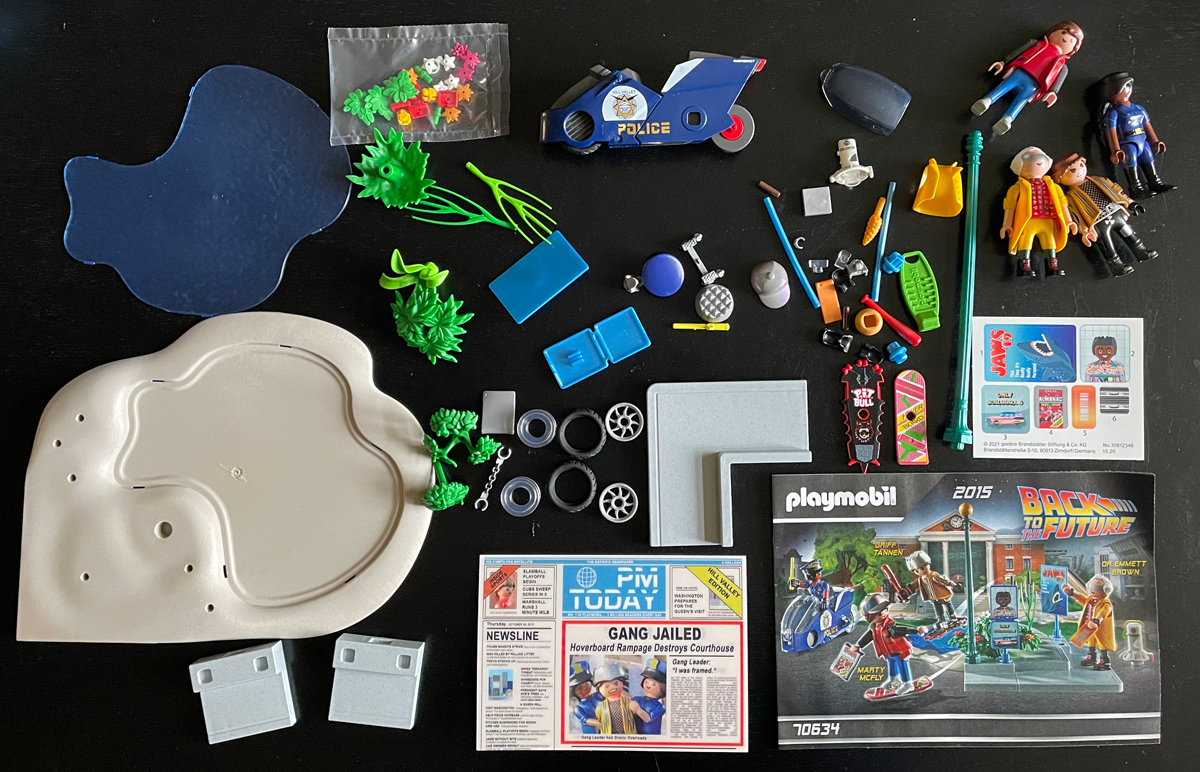Now on to the Back to the Future Part II set – where to begin?! For being a relatively small set, Playmobil managed to pack a ton of details in to ensure every memory was tugged when building and playing with it. All of the figures clothing is detailed to the film (with the odd exception of Marty’s shoes, but I think we can all guess why that might be), including the unforgettable meat grinder helmet on Griff and the polychromatic baseball cap Marty wears. Several street signs make us recall the Jaws 19 hologram, Goldie, and the $39 million dollar car (because inflation and capitalism, right?) The center piece of the part is a thin, translucent pond for Marty and Griff to fly over. And of course the futuristic license plate and Sports Almanac are required accessories! The police cycle is a fun addition, though with the side panels open I can’t help but think of it flying a la the Thunderhawk from M.A.S.K. which I’m fairly certain never happened in the film.