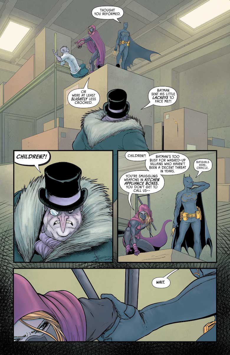 The backup this month is by Meghan Fitzmartin and Karl Mostert, featuring a fun cameo by Cassandra Cain and Stephanie Brown as they battle the Penguin. But it’s actually Penguin who plays the starring role in this story, as the old-school Gotham crimelord grapples with the fact that he’s been eclipsed in the new reality. He could retire and enjoy his real estate holdings… but instead he makes some very risky decisions to escalate his power. There have been a few great stories with Penguin that delve into his complex psychology, and this feels like another one, even if it relies a little too much on shock gore at a few points.