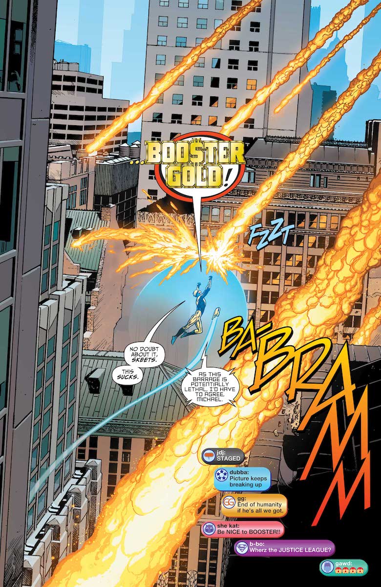 But things aren’t going so great for our heroes as the book opens. Ted Kord is semi-retired, haunted by both recent health issues and his bizarre shell game in the recent Suicide Squad run that saw him mistaken for the big bad and replaced by Black Mask. He looks oddly young here, which made me think Jurgens might be basing this off the Forever Evil Ted. But the dialogue indicates there’s a history here, and Michael’s up to his old tricks as well. He’s gone full social media, livestreaming his superhero battles to the world even with Skeets registering mild disapproval. And that’s all well and good most of the time—but as the issue opens, he seems to be the last hope to rescue the Justice League from alien invaders.