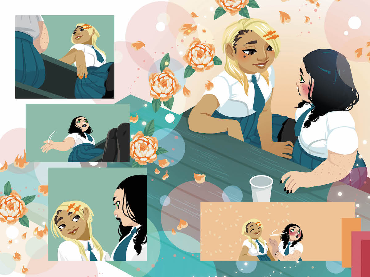 I should mention that this is essentially a romance book, with an LGBT romance at its core. Mandy’s love interest Claire, a popular girl who she’s been crushing on for years, is a good example of how to write a character who is likable and still prone to mistakes and falling back on bad old habits. The dynamic between them reminds me a bit of Luz and Amity from The Owl House, one of the best representations of young queer love in animation. But this definitely isn’t a kids’ graphic novel—the language gets surprisingly salty at points.