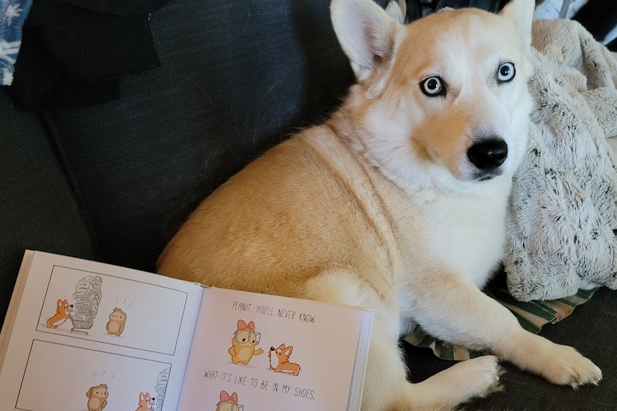 Considering the introduction refers to Peanut as a “stumpy-legged goober”, I expected accuracy in the portrayal of pups. I was not disappointed. The book covers everything from what we refer to in my house as Mandatory Belly Rubs, to food sneaking, to ridiculous amounts of shedding and bed hogging as well.