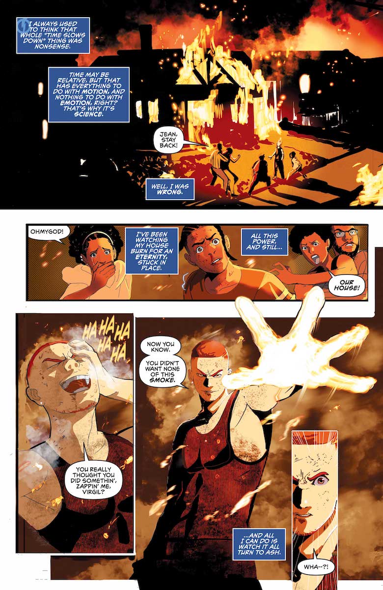 Equally strong, though, is the rogues’ gallery the book is slowly building. While Hotstreak is the big threat, the Government’s abuse of the newly transformed kids is becoming a common theme and a crisis flashpoint waiting to happen. But the more pressing threat may be Darius, an old friend of Virgil’s and a social media maven determined to expose the truth of the Bang Baby phenomenon—no matter who’s privacy he has to invade. This is an interesting subplot, with Darius being a danger to Virgil’s secret but maybe not entirely a bad guy. We get the introduction of a major new Milestone player only weeks before his own series launches—Curtis Metcalf, aka Hardware, now a fugitive from the government. Overall, it’s an intriguing start that has done a great job of getting us inside Virgil’s head and world, even if it hasn’t really separated itself from the genre yet.