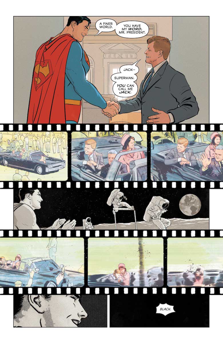 Ray: Many people assumed Grant Morrison might be wrapping up at DC after their recent epic Green Lantern run. But they’ve still got one more surprise for us—and it’s a return to their most iconic DC run. But this is a very different Superman from the optimistic All-Star run—teaming up DC’s most iconic hero with the gritty team of antiheroes straight from Wildstorm in a four-issue oversized series. But this isn’t the Superman we know, clear from the opening—when Superman in 1963 meets with JFK and makes a fateful decision that renders him unable to save the President’s life. That sets the tone for this series from the start—larger than life, but grounded in geopolitical events with a Superman who has seen a lot of history.