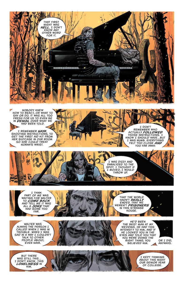 Ray: Two episodes in, this new Black Label series is probably the most effective horror story in comics in a long time. Equal parts apocalyptic thriller and Millennial Lord of the Flies, it starts with a brilliantly simple concept–a group of old friends and strangers bound by a mysterious benefactor find themselves at a luxurious lake house for the end of the world. This is only as good as the characters it features, and Tynion has already managed to flesh a lot of the leads out effectively. We start with a prologue as another of the cast flashes back to their time with Walter, and we see that the young tech magnate was troubled and haunted even then. In the presence, his surprise appearance caused chaos and left one member of the cast seriously wounded. I was glad Norah wasn’t taken out of the story for any length of time, and her injury only seems to deepen her cynicism–something she shares with other guests.