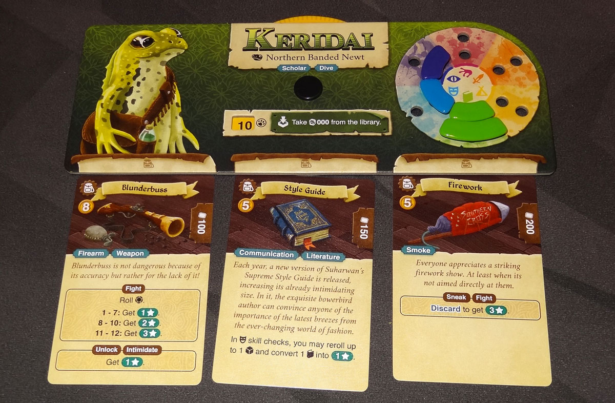 After choices are made or skill checks are passed (or failed), the story master may get some instructions in turquoise. Sometimes cards are returned to the library, you may gain money or prestige, or you may get new cards. Each character may have up to three items stored below their board—any others are returned to the box.