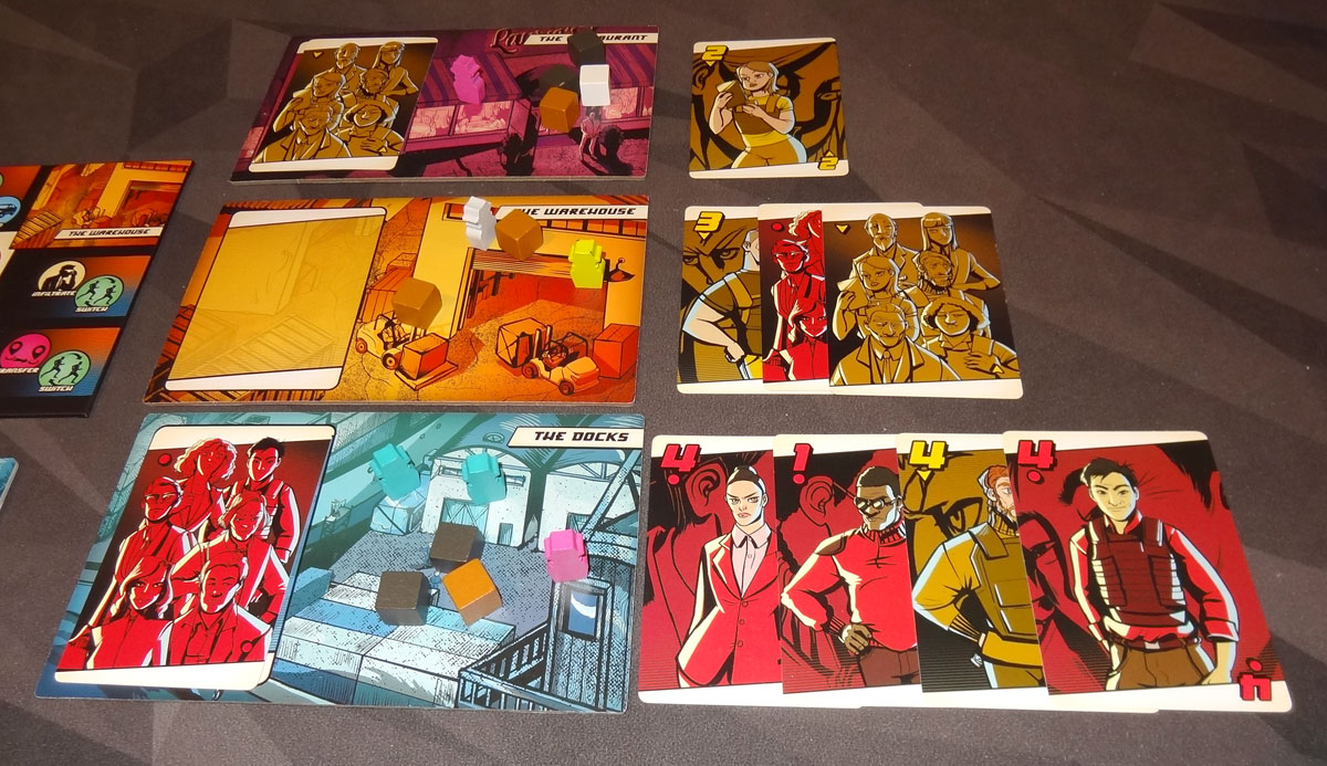 The meeples are little shady characters, with the wide-brimmed hats and turned-up collars, though their colors aren’t as suited for subterfuge: bright pink, lime green, and so on. The crates are medium-sized wooden cubes, a bit larger than the ones you often find in games.