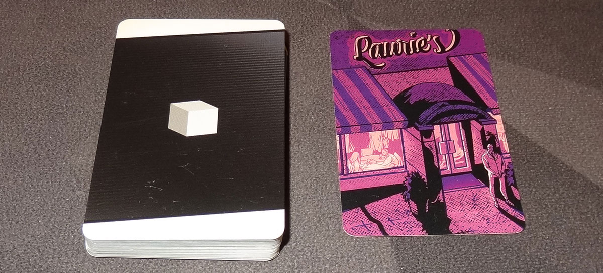 The other boards are fairly simple: the police board has a number of spaces around the outer edge, with some information about busts in the center, and the location boards have some space to place meeples and cubes on the right side, and a space for a card on the left side.