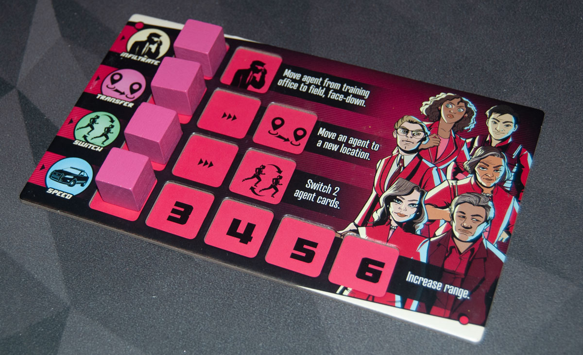 And those abilities are great. Infiltrate is the easiest one to charge up, allowing you to move a card into the field face-down, which is where the bluffing comes in. (You can use it on other players, but typically you’d use this on yourself.) Transfer and Switch take more training stops before you can use them, but they’re extremely useful, particularly because you can move anyone’s agents (as long as they’re at the end of the row). A well-timed Transfer can trigger a bust or delay it, and a Switch can create a huge shift in player strengths at a location or make somebody waste a lot of strength at a place they were already winning.
