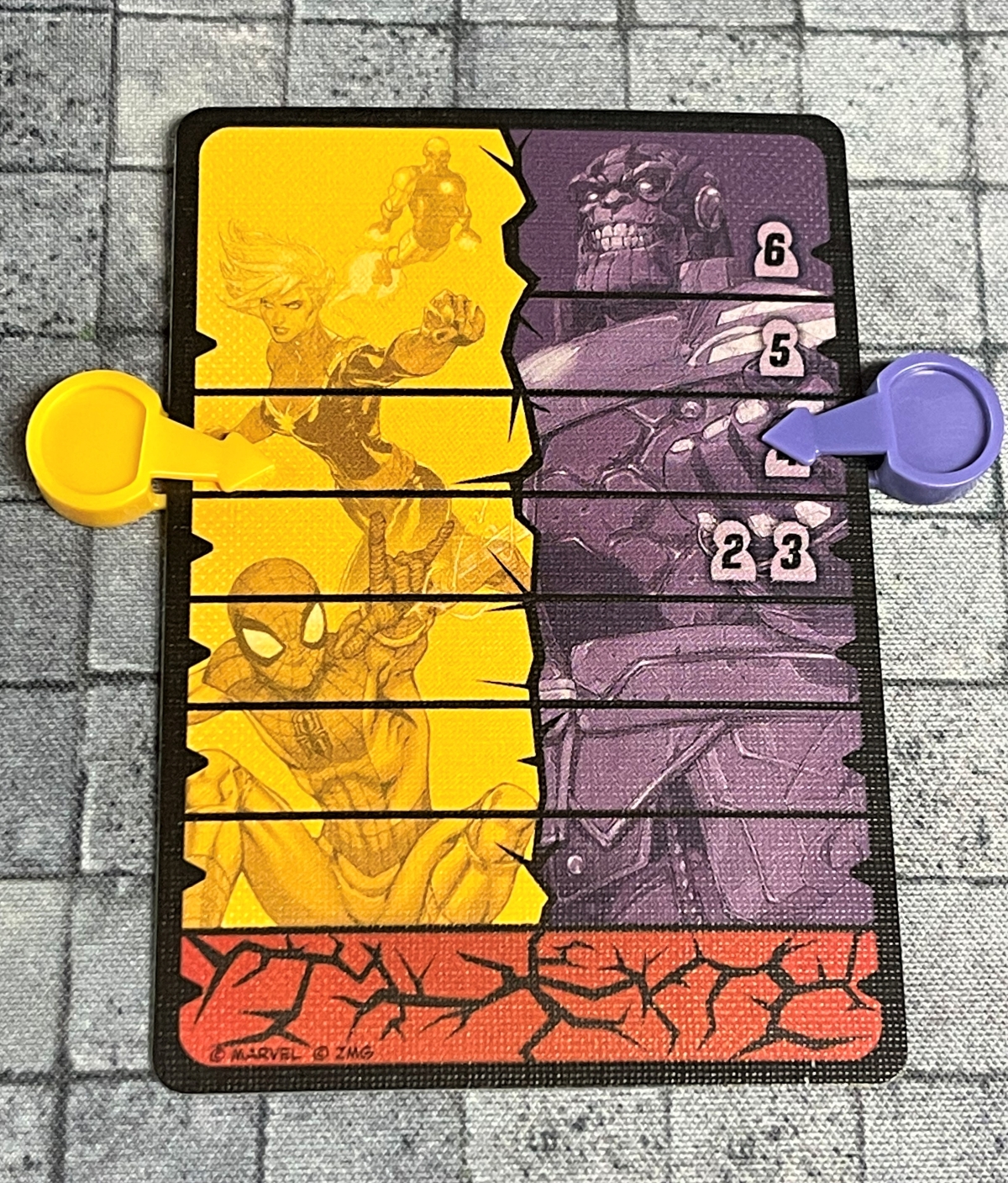 Place the yellow tracker on the top left space of the life tracker card, and the purple tracker on the space matching the number of players (including Thanos). Place the life tracker card in the middle of the table.