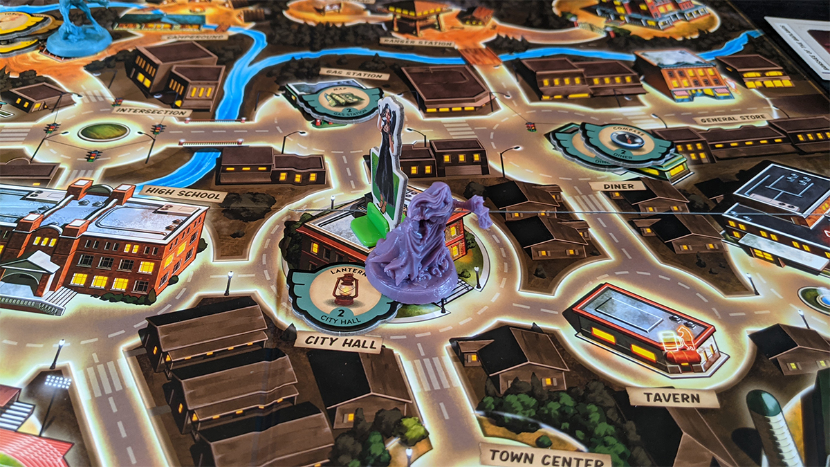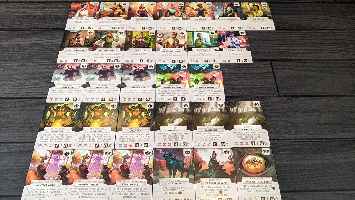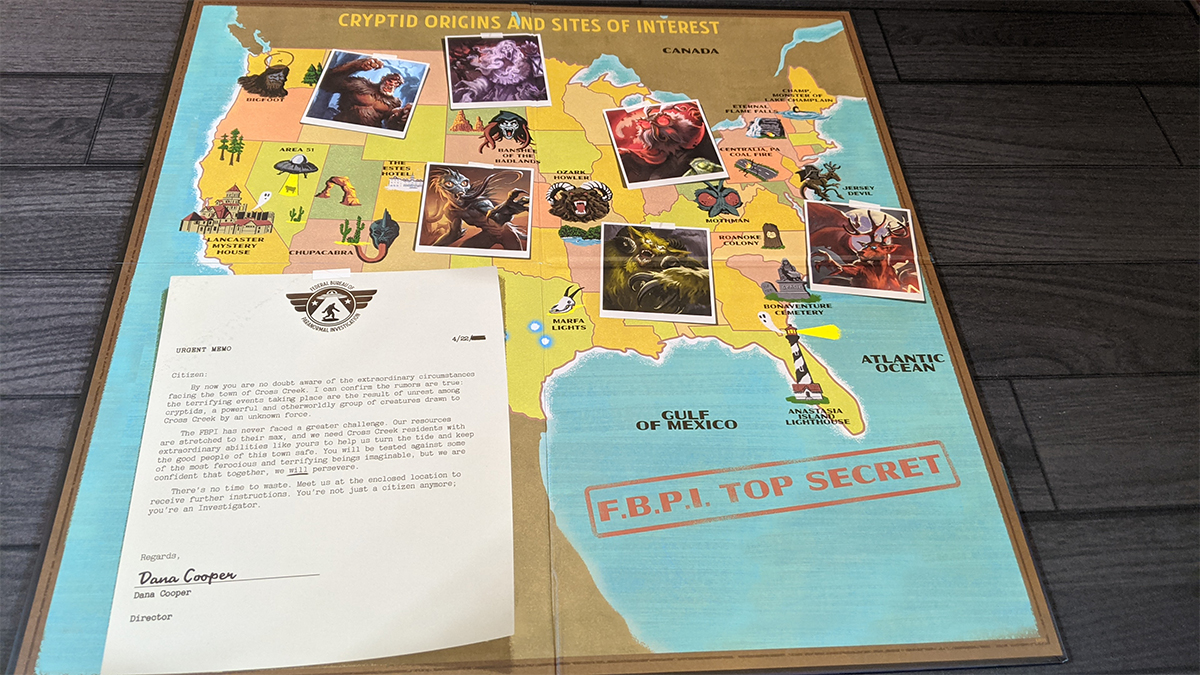 The board is about 2 feet square, and laid out with a map of Cross Creek, a small town that is unfortunate to be beset by a series of monsters from American myths: Bigfoot, the Banshee of the Badlands, Mothman, the Ozark Howler, the Chupacabra, and the Jersey Devil.