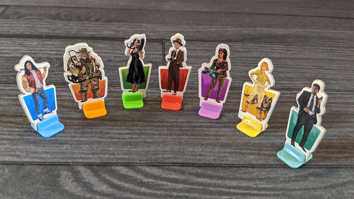 The matching (but much smaller) standees are color-coded twice, in the background of the art and the colored plastic stand, making it easy to find your character on the board.