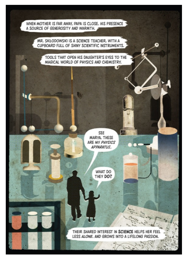 This is truly a work of art. It’s a masterpiece of illustration and text where each image is pure poetry that gives homage to a brave trailblazer in science—a woman who won the Nobel Prize twice for her groundbreaking discoveries, whose death by uranium poisoning is infamous, but about whose life little is known aside from those few facts.
