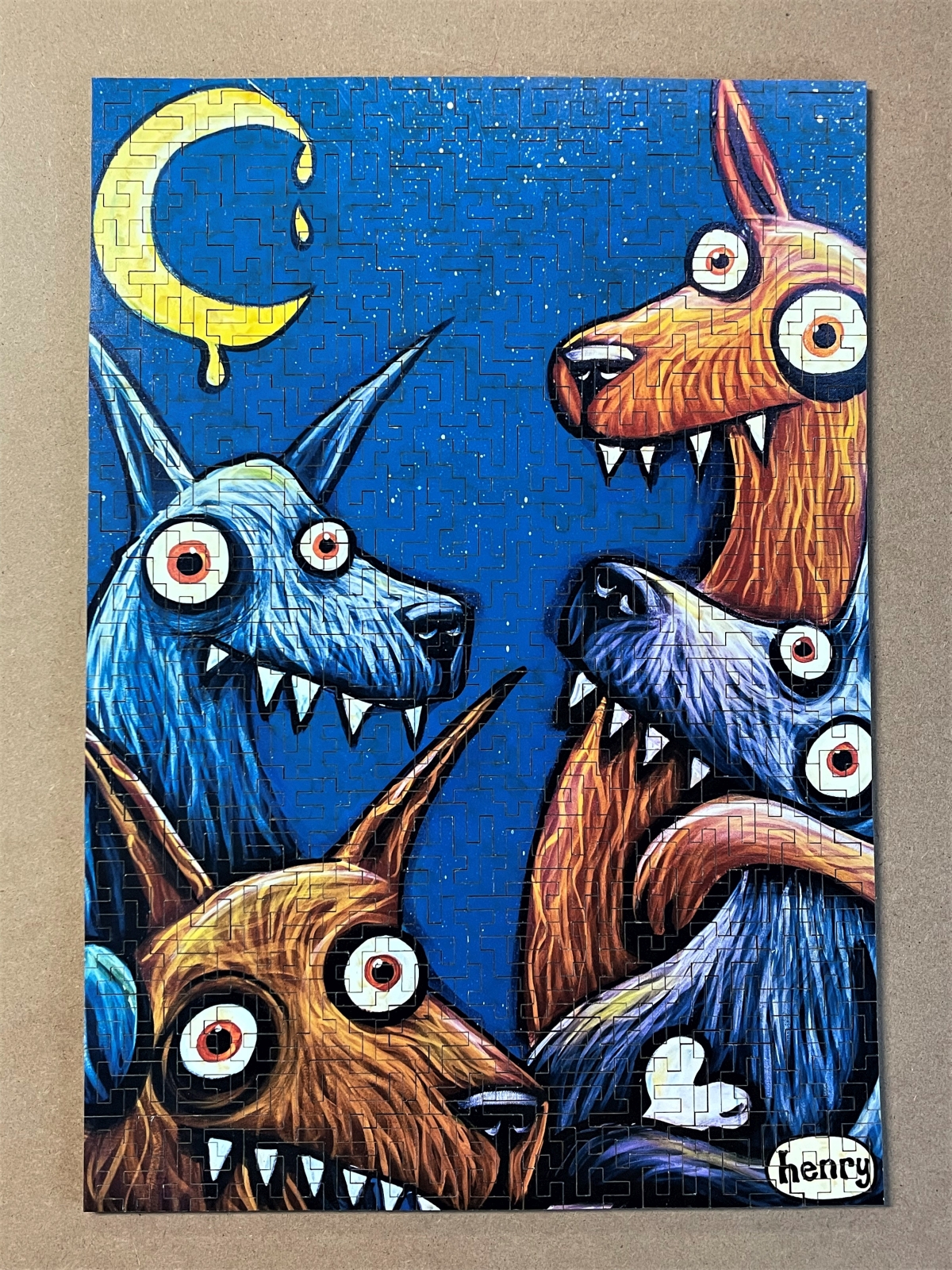 Next, I moved on to Wolves and the Moon, which used Bewilderness’ signature geometric cut pieces. The 326-piece puzzle’s art is by Henry, with puzzle design by Whitney. Wolves and the Moon retails for $99 and is available here. Like Earth, the puzzle comes nicely packaged in a glossy box with a magnetic closure.
