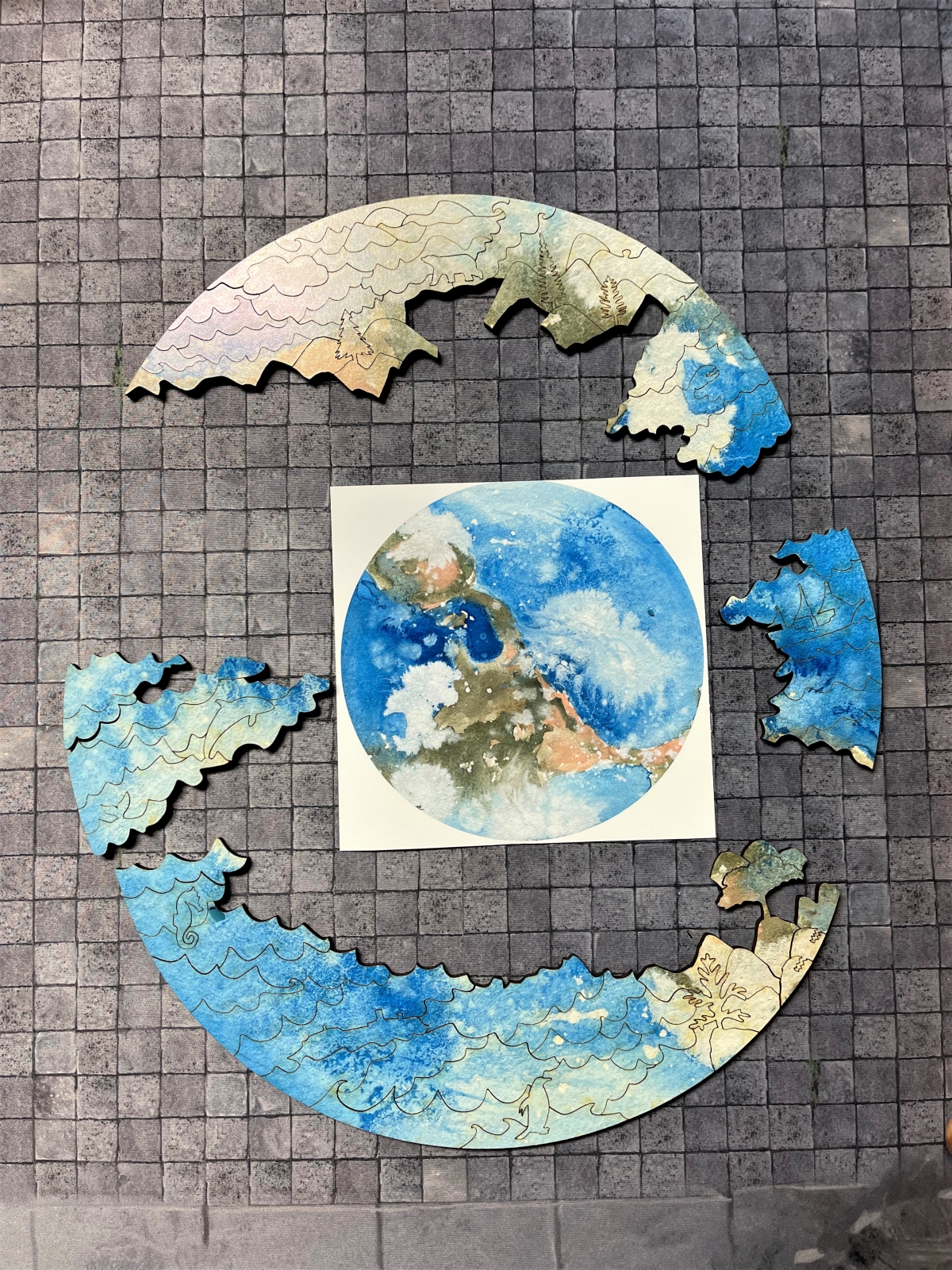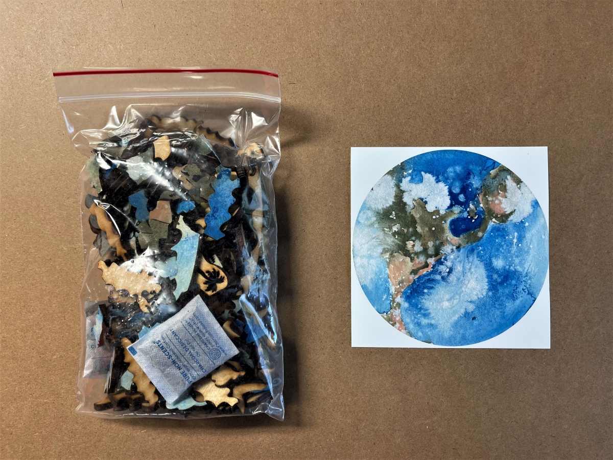 The first puzzle I started with was Earth, a 199-piece puzzle with a watercolor painting design by artist Erin Darling. It retails for $95 and can be purchased here. It came in a surprisingly compact glossy-white box with a magnetic closure. Opening the box, the puzzle pieces are in a zippered plastic bag, which is nicely wrapped in tissue paper. There is also a copy of the artwork, for reference while building the puzzle.