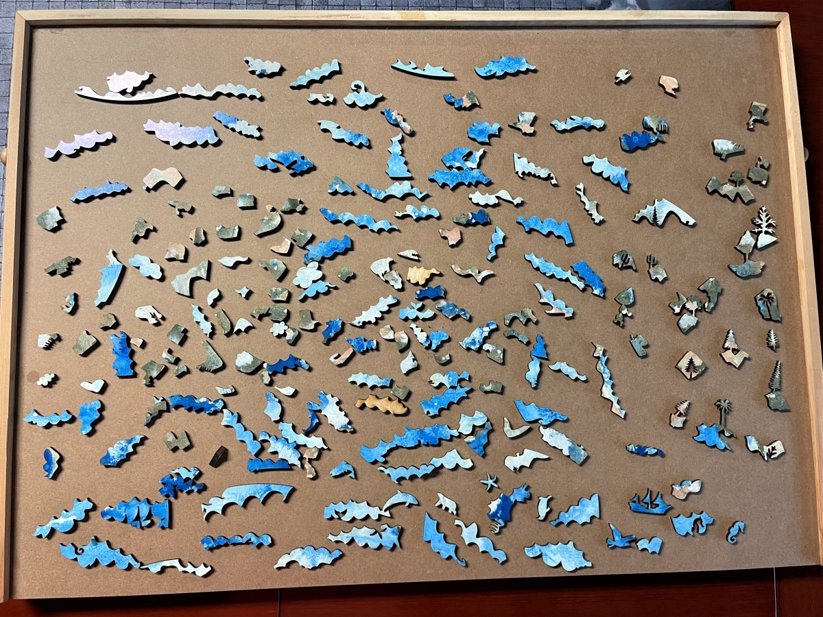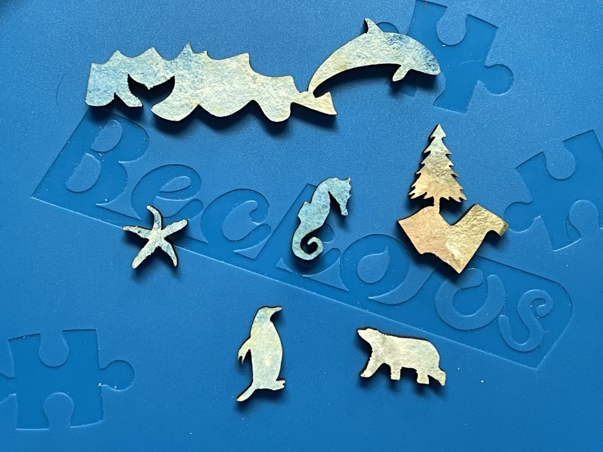 Working with wooden puzzle pieces is different from your typical cardboard puzzles. Except for pieces that tightly interlock, such as a curled tail of a seahorse into its matching piece, wooden puzzle pieces can easily be knocked or slid out of place.
