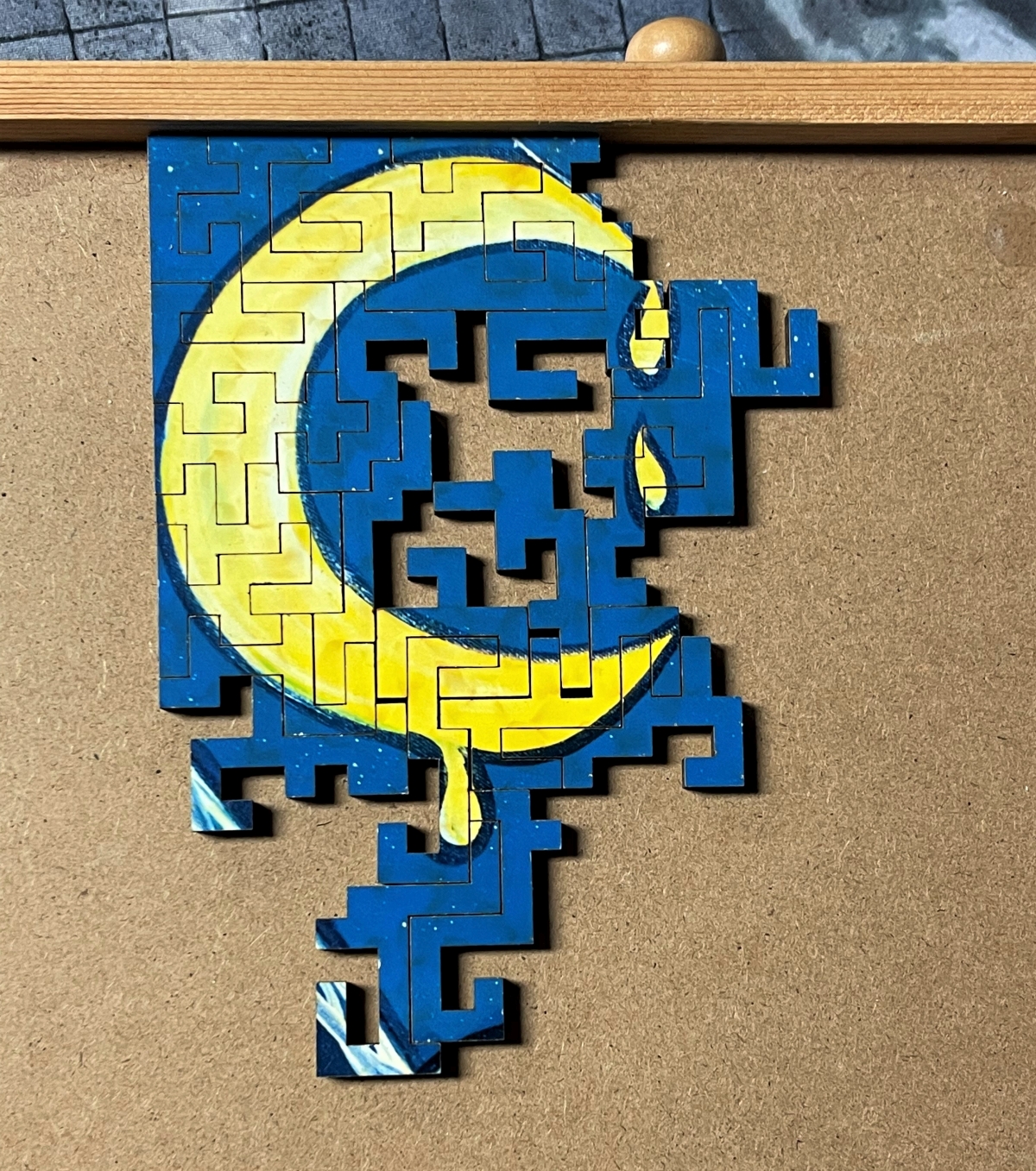 Both of these puzzles were definitely challenging, each in its own way. I found that with Earth, the number of very small pieces could make it tricky to find where exactly everything fit properly. Thankfully, once the larger pieces are in place, it’s easier to see where to slot in the little ones. With Wolves and the Moon, the geometric pieces provided their challenge in seeing where they fit properly. This was especially the case with the starry sky, which I had saved for last. There were times that I was definitely wondering if I was assembling that part of the puzzle correctly, and was worried I may need to pull out pieces and start again. But, thankfully, I had put it together right, as you can see above.