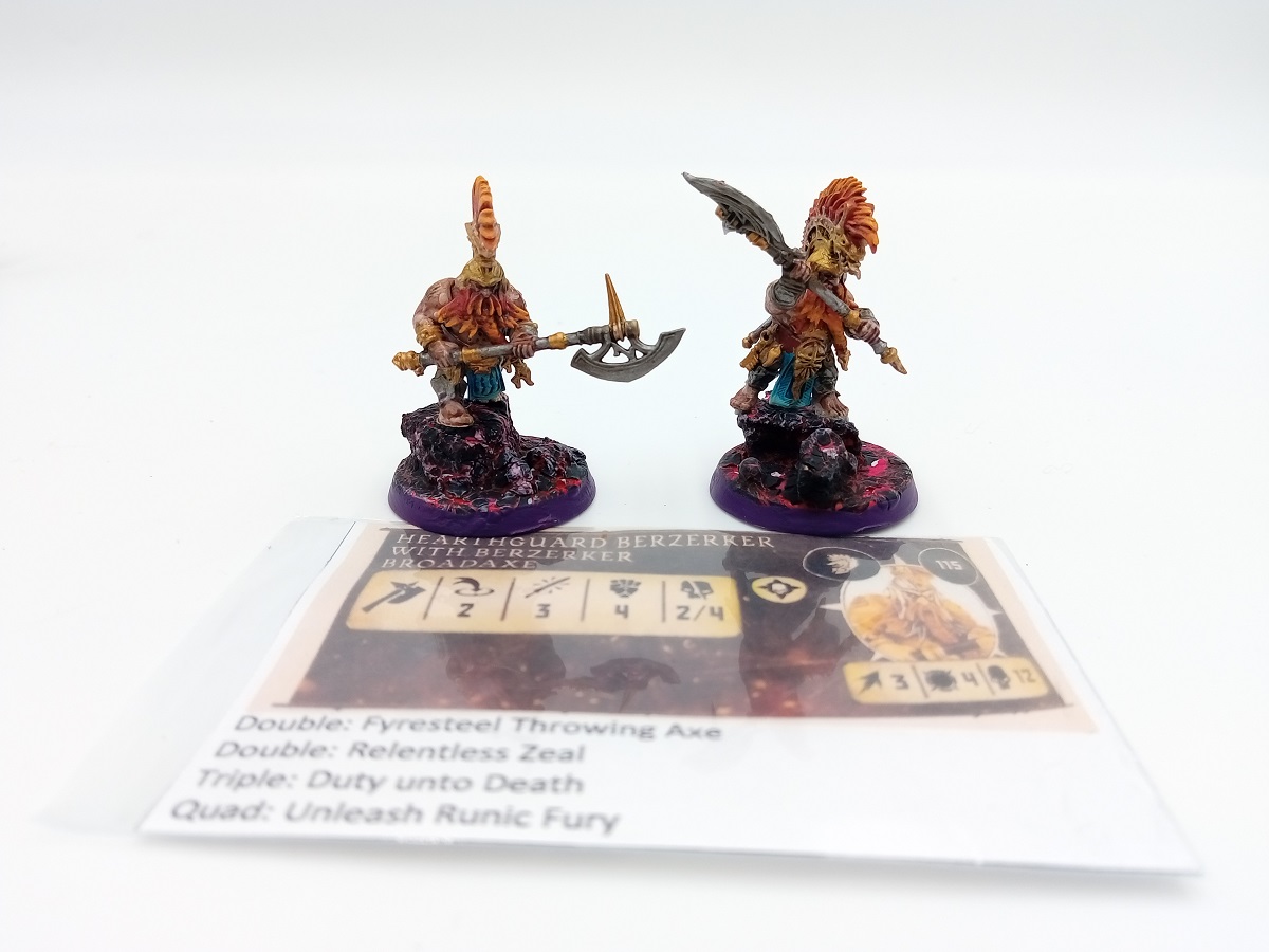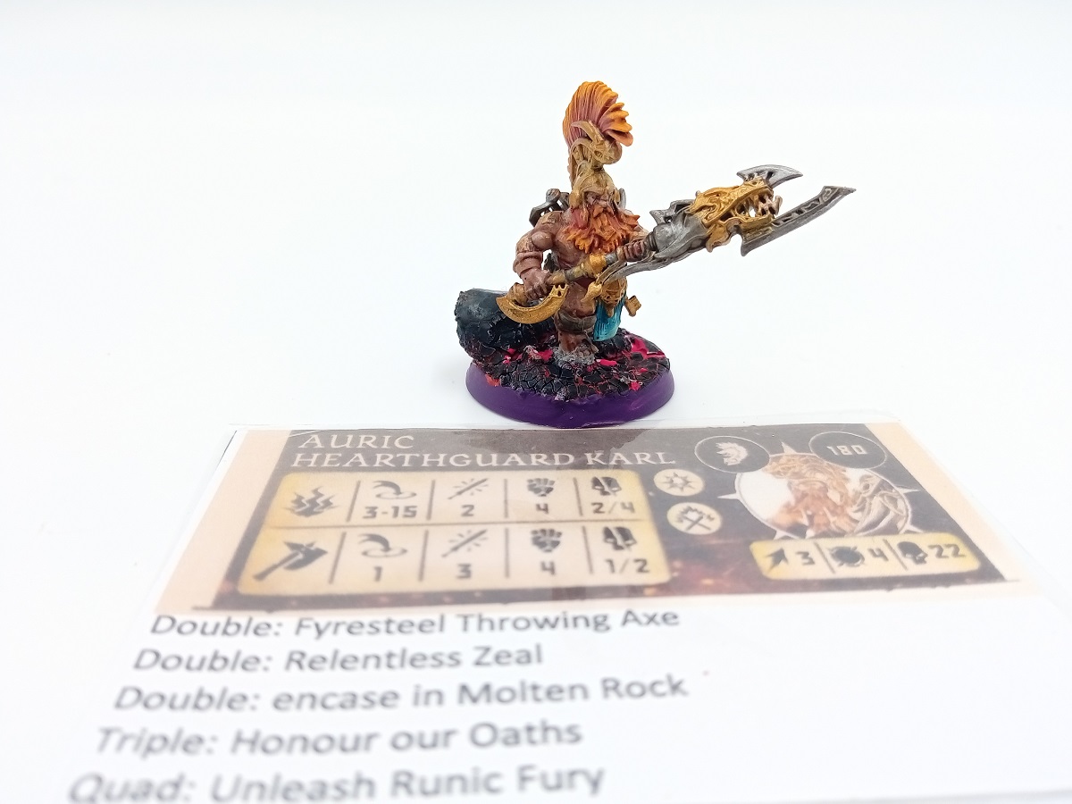 In Sentinels of Order there are four Vulkite Berserker options, apart from the Vulkite Karl (Karl is apparently a Fyreslayer word for leader), they are the lowest points options for the Fyreslayers, so these would be useful in making up the numbers if required later. But I do like the model for Fjul Grimmir. So I decided he would be my warband leader, and I would use the Auric Runefather fighter card for his stats. I would also use the Vulkite Berserker Karl stats for Tefk Flamebearer and could use him as an optional hero for the warband if playing a game where that was an appropriate option. But for the main part, and because they don’t have the sling shields that the other Vulkite Berserkers do, I would use the Vulkite Berserker with Pair of Fyresteel Handaxes stats for the dual-axe-weilding Vol Orrukbane and Mad Meagrim.