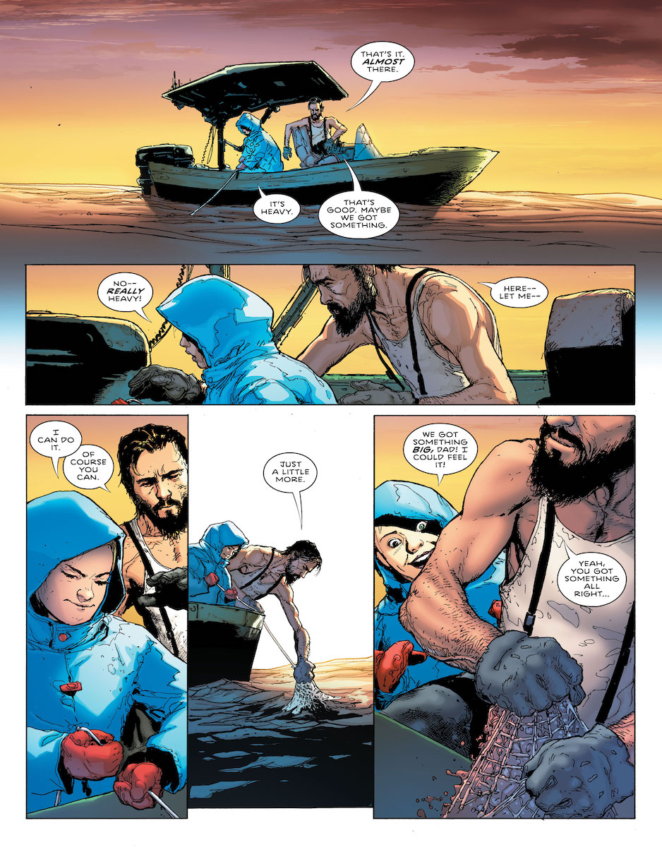 Ray: Whenever Jeff Lemire returns to the DCU, it’s an event. That’s the case for this stunning new Black Label miniseries, a gruesome horror tale that spins out of the mythology Lemire and Snyder developed in the New 52 era. But as it begins, Swamp Thing is nowhere to be seen. The world is in dire straits, with the only people seemingly still alive being a small colony in the middle of nowhere. Some live in a humble fishing village where a father tries to coach his daughter in how to survive and warns her to stay away from the mysterious lighthouse where a dark figure lives. But they’re frequently terrorized by a nearby band of pirate raiders who make their home on an abandoned oil derrick—and their leader has surprising ties to the father.