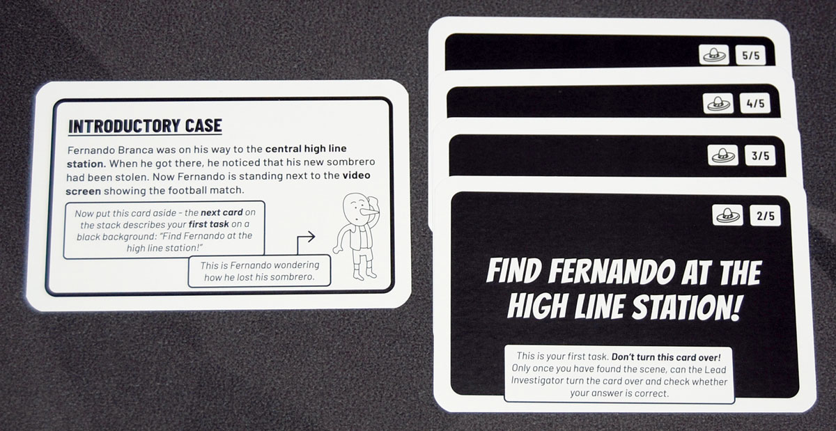 As an advanced alternative, you can also try solving a crime by just looking at the white starting card, and seeing how much of the story you can figure out without looking at the black cards. Then, after you think you’ve pieced together the whole crime, go back through the black task cards and see if you missed anything.