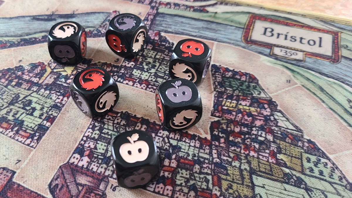 Finally, we come to the easiest win condition, which happens to be losing. If no one crosses through the gate out of town in a healthy state, then everyone who has the plague wins, if you can call that winning. So you see at some point, your strategy will switch from trying to stay healthy and get out of town, to infecting as many people as possible so you win because no healthy tokens made it out. The Black Death certainly wasn’t a time of fun and games, even if Bristol 1350 happens to be a fun game about the Black Death.