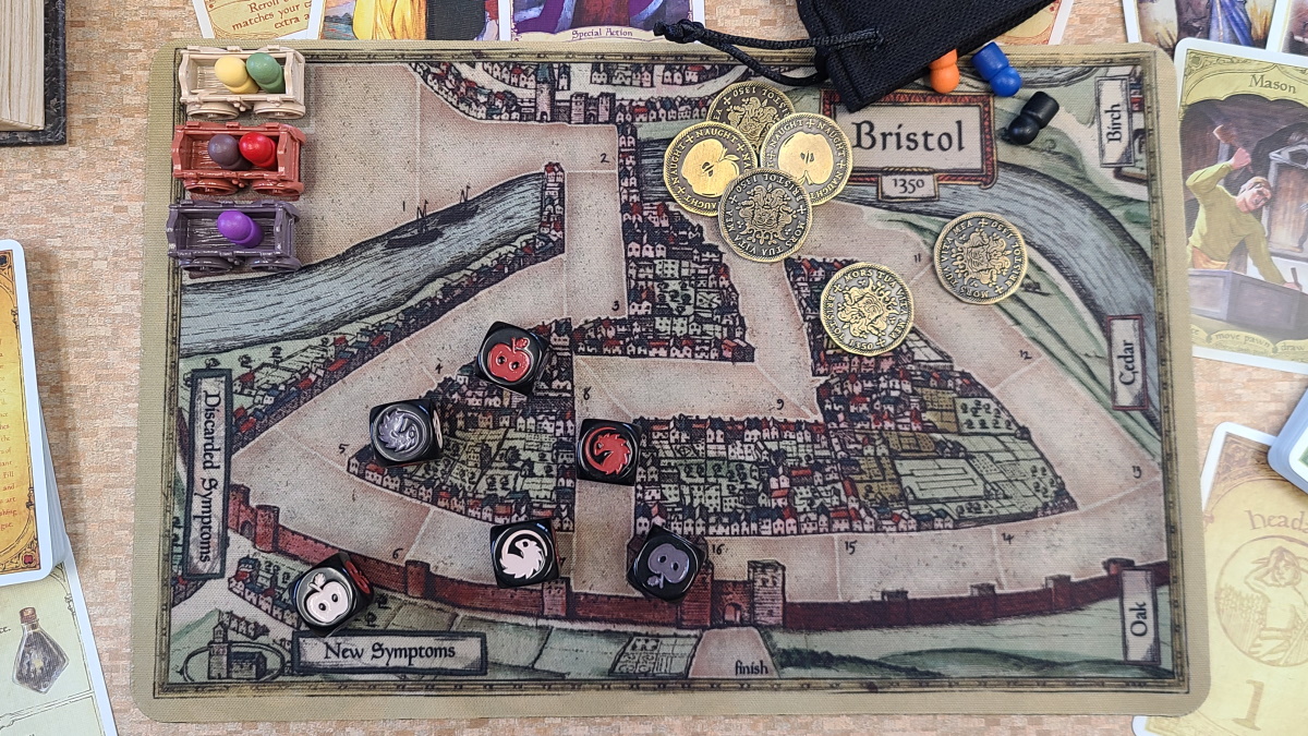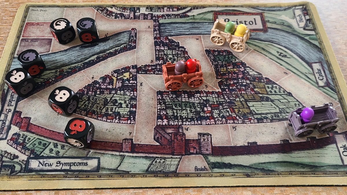 The neoprene game board is a refreshing take on a standard board. It rolls up for easy storage, and it adds a higher quality feel to the whole game. The board itself is printed with a map of medieval Bristol with a road winding through the city that your carts must make their way along. There are also printed areas on the board showing where you can put symptom cards, and areas for cards for the mingle phase of each cart.