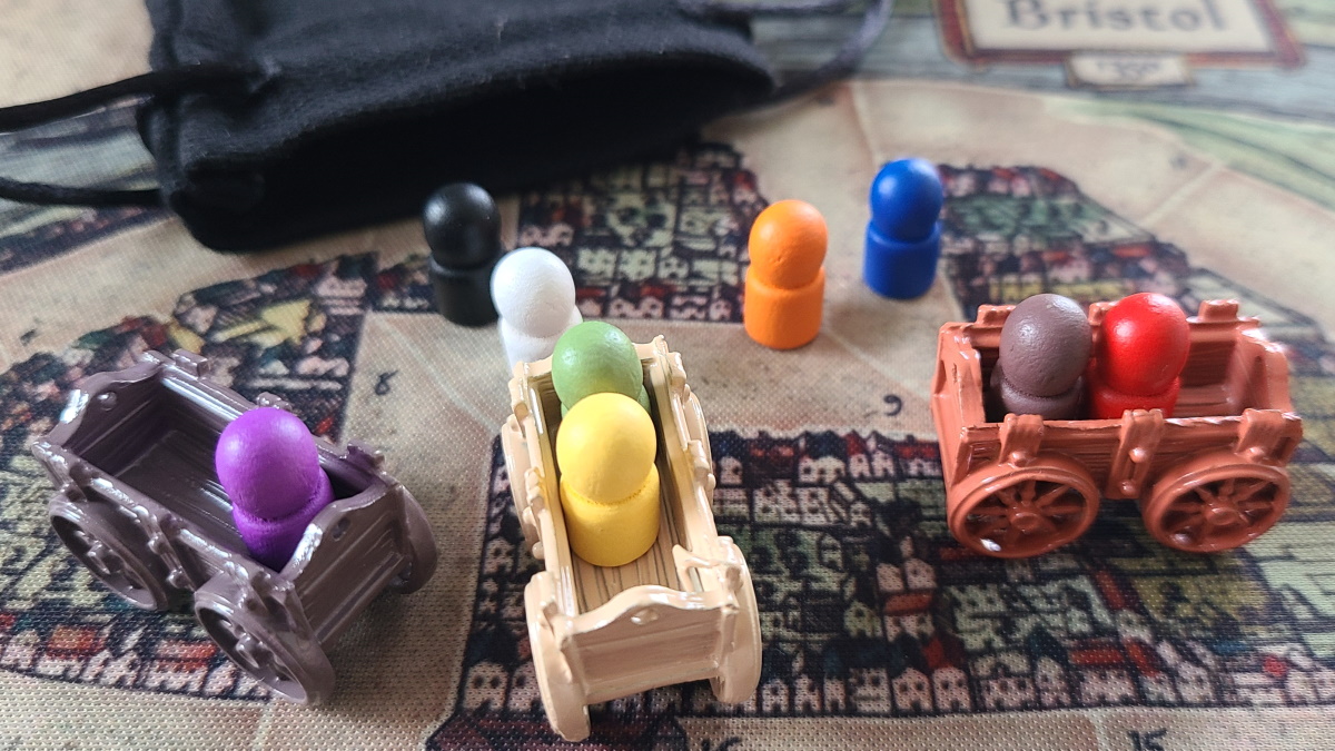 The components used in Bristol 1350 really do help make the game. The theme is very well carried out with the pieces, and the relative simplicity of them helps keep the focus on the game itself. The carts are meant to represent wooden carts that you are riding in to escape Bristol, England, and the Black Death spreading there. The different colors represent birch, cedar, and oak wood. I have the deluxe edition of Bristol 1350 and the carts are metal. The normal edition includes resin carts in the same colors, and from the pictures I have seen, they also look very well made. The pawns are simple wooden pieces painted in distinct colors.