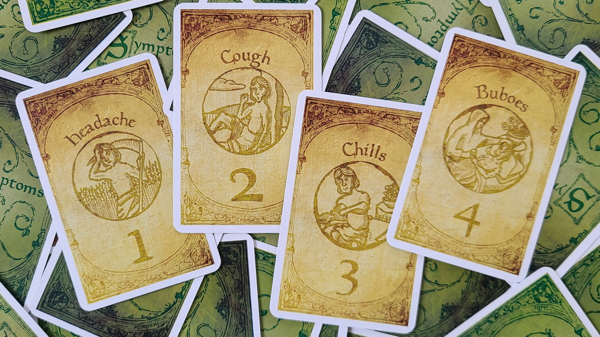 Once you have the carts populated, you can then set up the deck and draw cards. Begin by removing all “buboes” (symptom cards worth four) from the symptom deck. Shuffle the remaining cards and deal two to each player. The goal is for all players to start with symptoms totaling five or less, so if any players ended up with both cards being “chills” (value of three), then take those cards back and deal two more to them. Now you put the “buboes” symptoms back in the deck and shuffle it. Place it face-down next to the “New Symptoms” label on the board. Shuffle the remedy cards and give each player a number specified in the setup table in the instructions. Place the remaining cards face-down next to the board as well, and you are ready to begin.