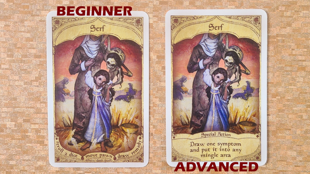 The final action you can take is moving your pawn, which can be done in one of three ways. You can “elbow” your way to the front of the other pawns in your cart. If you are at the front of your cart, you can “dash” to the cart in front of you. If that cart already has three pawns in it, the rear pawn in that cart gets bumped to the front of the cart you are leaving, essentially swapping places with you. The final move you can take is “pushing” your pawn or another pawn behind you on your cart off of the cart. The pushed pawn is placed as far back in the cart chain as possible, taking the furthest back spot. If there are no spots available, then that pawn is left behind, doomed to die of the Black Death. An interesting side note here…if you are pushed off and left behind, but you were healthy, you can reveal that fact and the person who pushed you dies of shame and also gets to sit out the rest of the game with you.