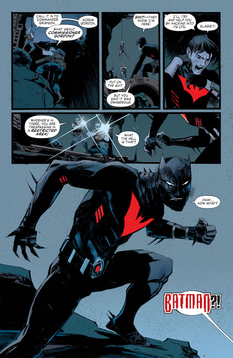 Ray: It looked like the White Knight universe was over, with Bruce Wayne in prison for a long time and the Harley Quinn miniseries tying up loose ends. But this new series gives us a time jump and a new twist. Not surprisingly, it’s a reinvention of the most famous next-generation Batman story—Batman Beyond. As the issue opens, a young Terry McGinnis raids the ruins of the Batcave and recovers an experimental Batsuit equipped with flight and razor blades. Sure enough, it soon tears through guards and largely takes over for Terry as he flies towards his destination—the base of Derek Powers, who has taken over much of Wayne Enterprises and plans to create a new, more militarized version of the Bat-legacy. It’s a full-on noir reinvention of the classic cartoon, and I’m not sure the two tones really mesh well together, especially with DC doing a much more faithful continuation of the show.