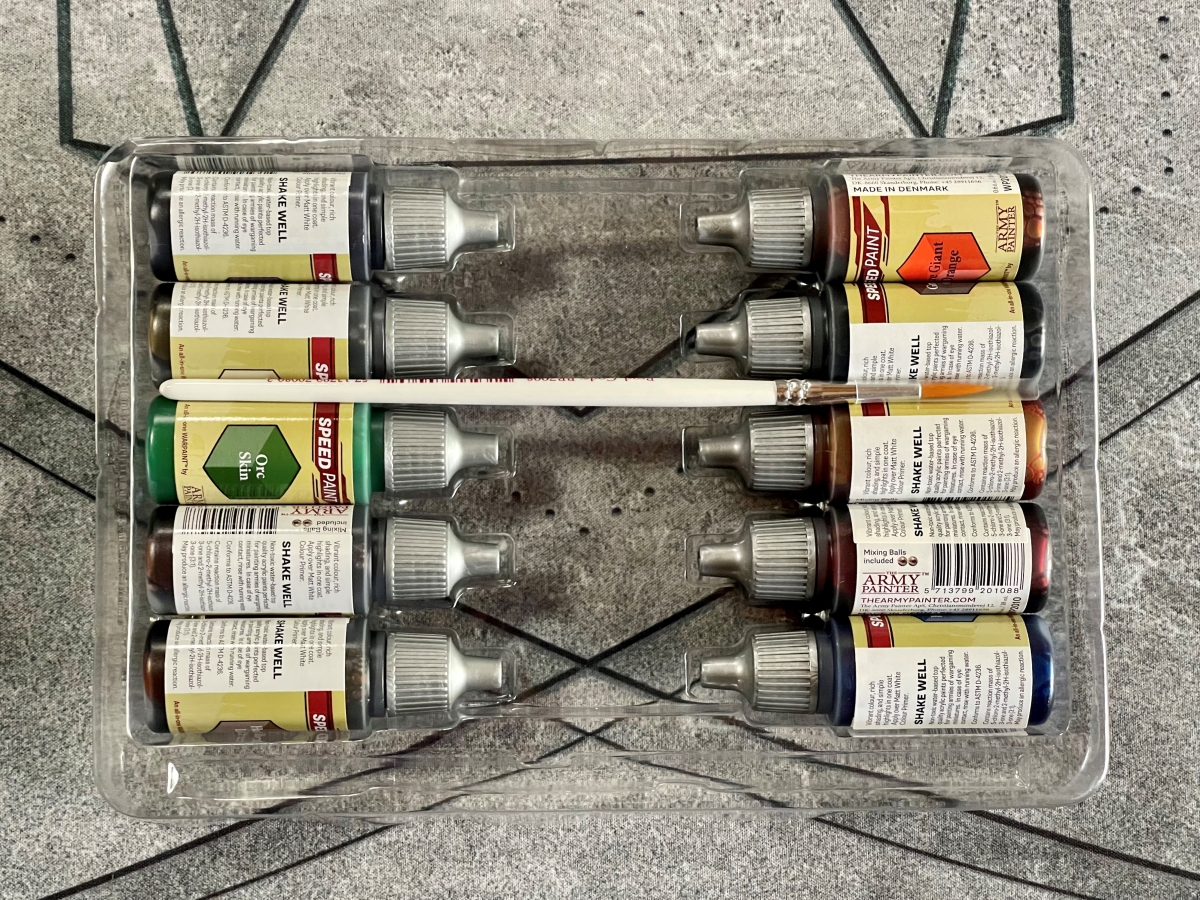 Inside of the box you’ll find a Wargamer: Monster paint brush, a painting guide, and the following ten 18ml Speedpaint colors: