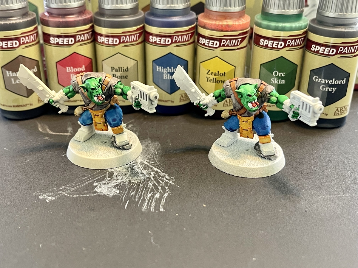 I wanted to do my best to paint both models identically, using the same colors for both to compare tones. As this is only a starter set of 10 paints, I didn’t fully paint the models, as I was missing some key colors that I would want to use to finish them. Still, I figured this would give a good example of how a model looks when painted with Speedpaints. Here are the two Orks, with the colors I used showing behind them. Following Army Painter’s guidelines, I only used one generous coat of each color on the model.