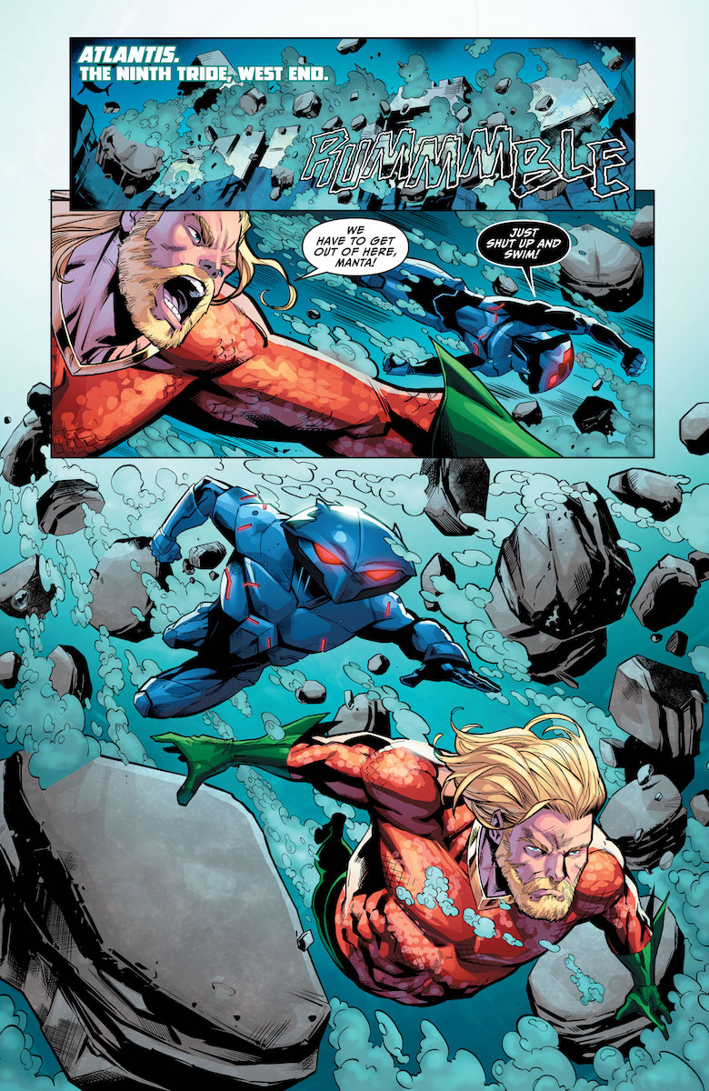 Ray: One of the best parts of this series is how it pulls from multiple different runs—not just the recent Thomas and Brown minis, but the runs of Kelly Sue DeConnick, Dan Abnett, and even earlier takes on the Aquaman mythos. The teeth-clenched teamwork between Arthur and Black Manta is the main selling point of the series for me, especially as they invade the ninth tride and foil the career ambitions of some unfortunate soldiers. But while they’re the biggest personalities in the series, the heart of the book really belongs to Jackson Hyde. Still recovering from the traumatic events of his solo series and the near-death of his mother, he’s angrier and more reckless than he’s ever been before—and that may be the only thing that unites Arthur and Manta. While Jackson is definitely the most unambiguously heroic character in the series, this issue shows how he’s setting himself up for danger.