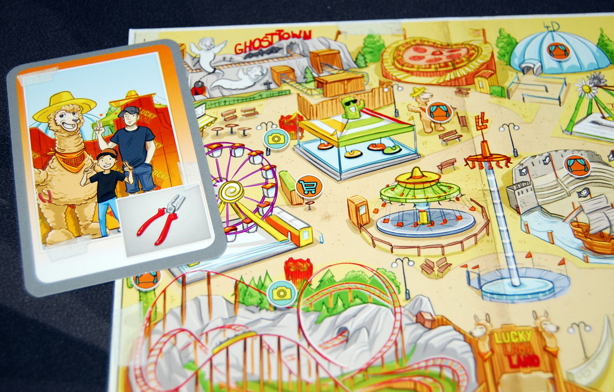 The investigation file is a single folded sheet that contains a lot of information you’ll need for understanding the clues: dossiers on each suspect with name, age, and shoeprint; the length and weight of the three tools used for sabotage; a chart showing which rides were open for a particular week; and a park map of Lucky Llama Land with points of interest marked. The park map in particular is nicely done and looks like something you’d get from a theme park—you actually only need a couple of the icons on it for the game, and the rest are just there for flavor. Although the information is identical in the files, they do have different detective names on the cover, just as a fun extra detail.